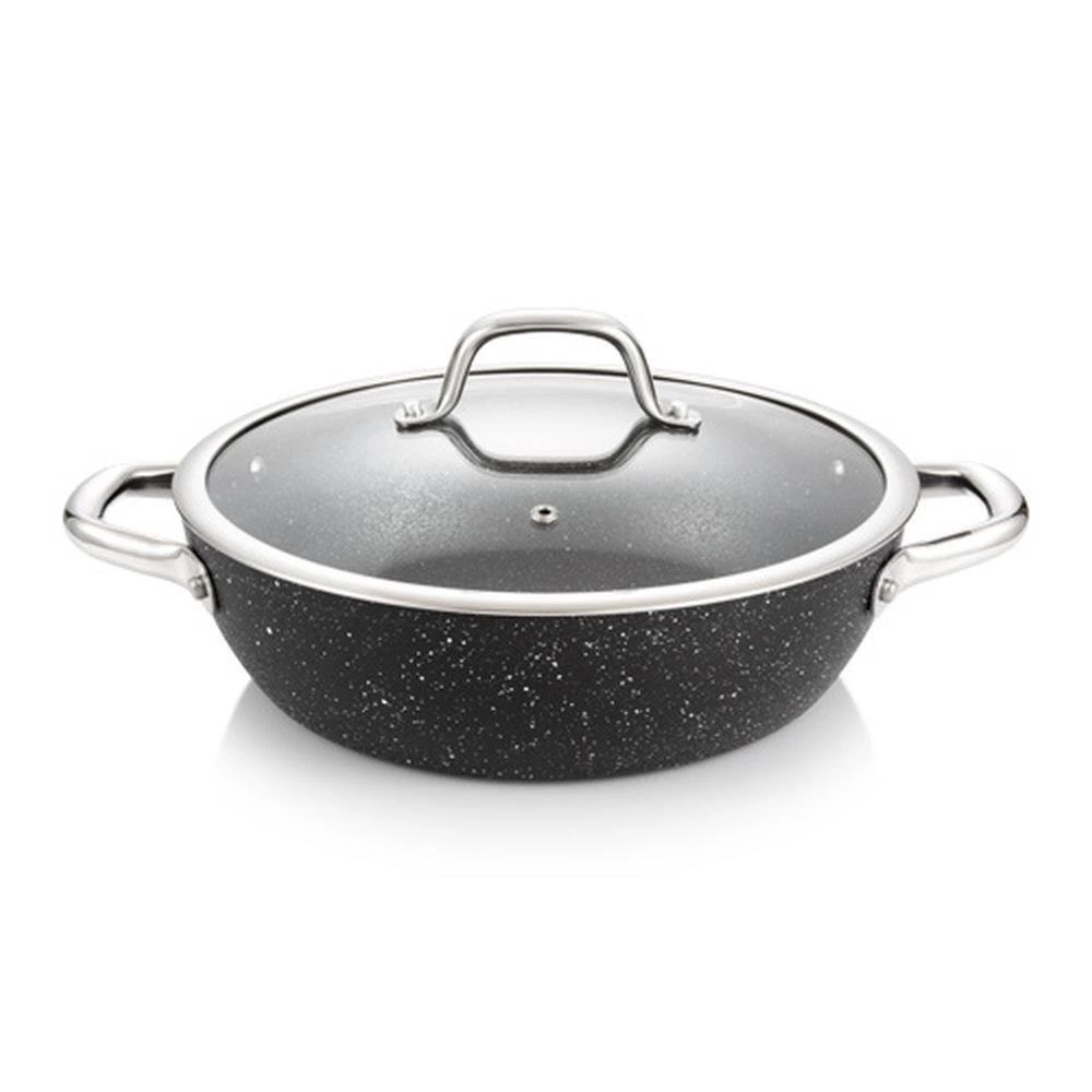 Wysokiej jakości, solidna, głęboka patelnia indukcyjna w zestawie z szklaną pokrywą może być również wykorzystana również do zapiekania potraw w piekarniku.