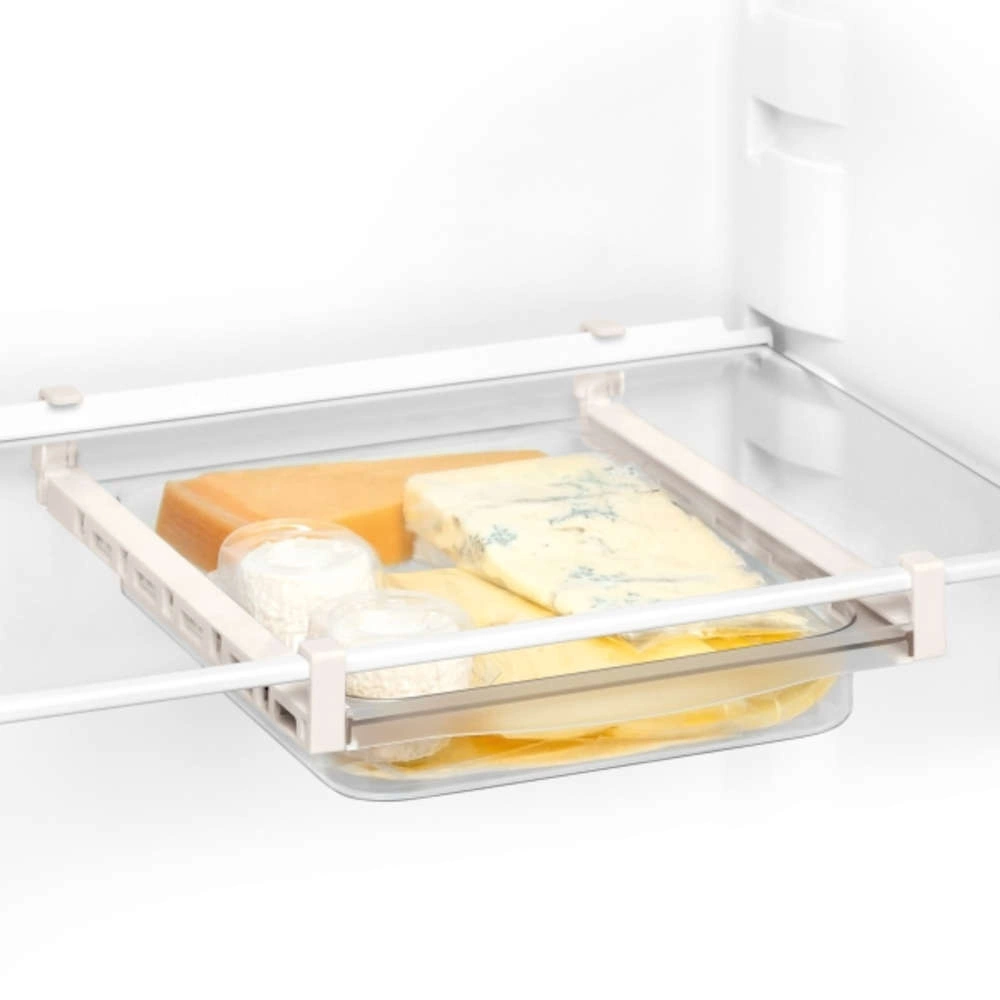 Podwieszana szuflada do lodówki z przezroczystym pojemnikiem to nieoceniony pomocnik przy utrzymaniu porządku w każdej lodówce. Można go również zamontować pod półką w szafce kuchennej. Wysuwany pojemnik umożliwia łatwy i szybki dostęp do jego zawartości. Posiada przezroczyste ścianki dzięki czemu widać co się w nim znajduje bez konieczności jego wysuwania.