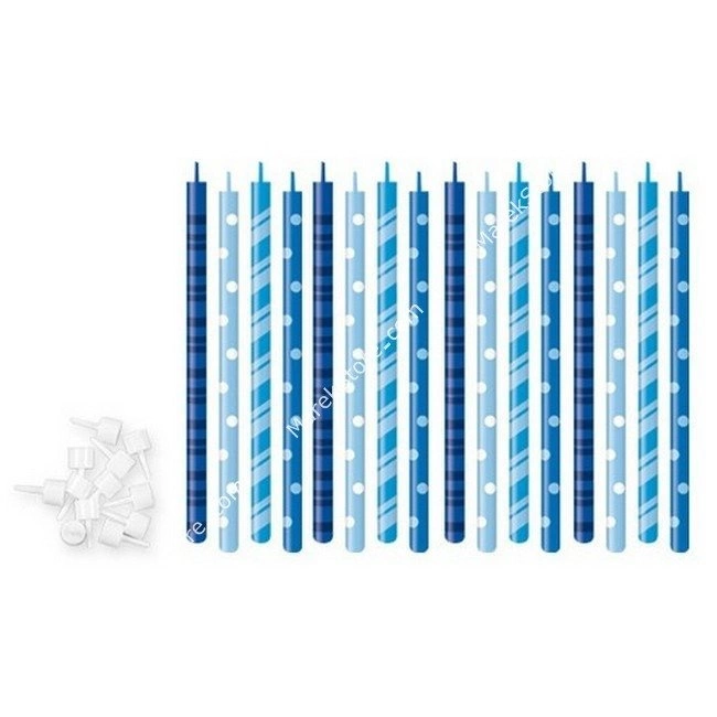 Komplet szesnastu wysokich świeczek urodzinowych w różnych odcieniach niebieskiego. Znakomite do ozdabiania tortów dla chłopców. Wykonane z wysokiej jakości parafiny, knoty wykonane z włókna naturalnego.
